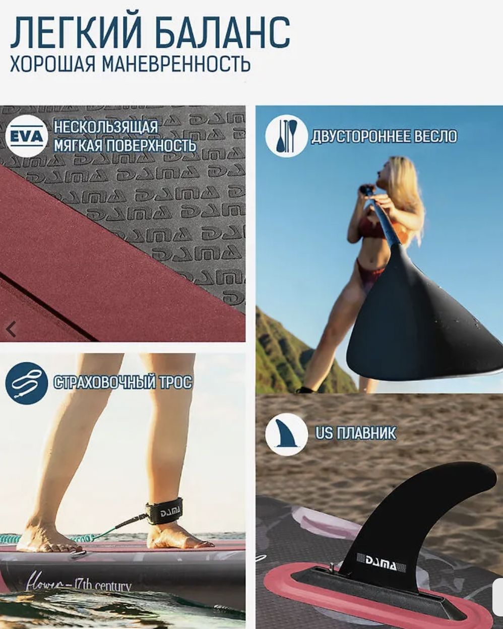 Если вы хотите купить сапборд dama и сомневаетесь в выборе модели или размера — обращайтесь за консультацией к нашим экспертам. Магазин «В ластах» работает с 2012 года, мы продаём снаряжение для водного спорта и хорошо знаем, какая sup доска подойдёт под ваши задачи, вес и уровень подготовки. Консультация бесплатна, доставка осуществляется по всей России.