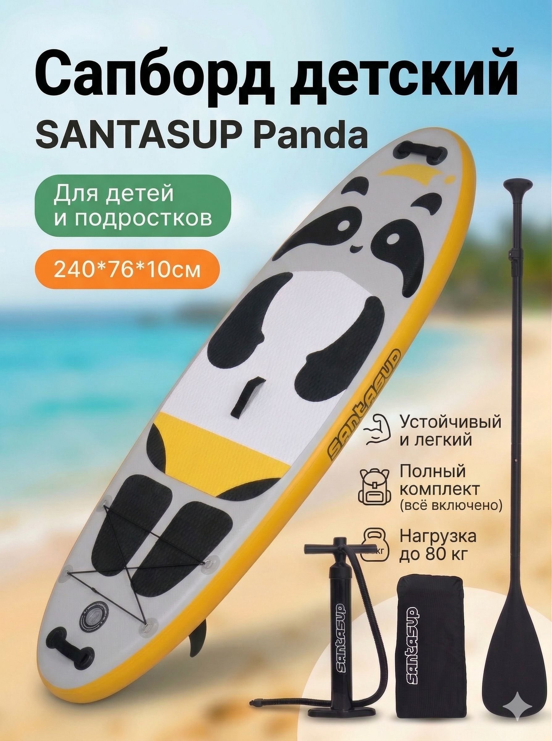 Детский сапборд SupPanda — компактная и лёгкая надувная доска для юных райдеров. Размер 240x76x10 см и вес всего 6 кг — ребёнок сможет нести доску к воде самостоятельно. Максимальная нагрузка 60 кг, яркий дизайн с пандой.