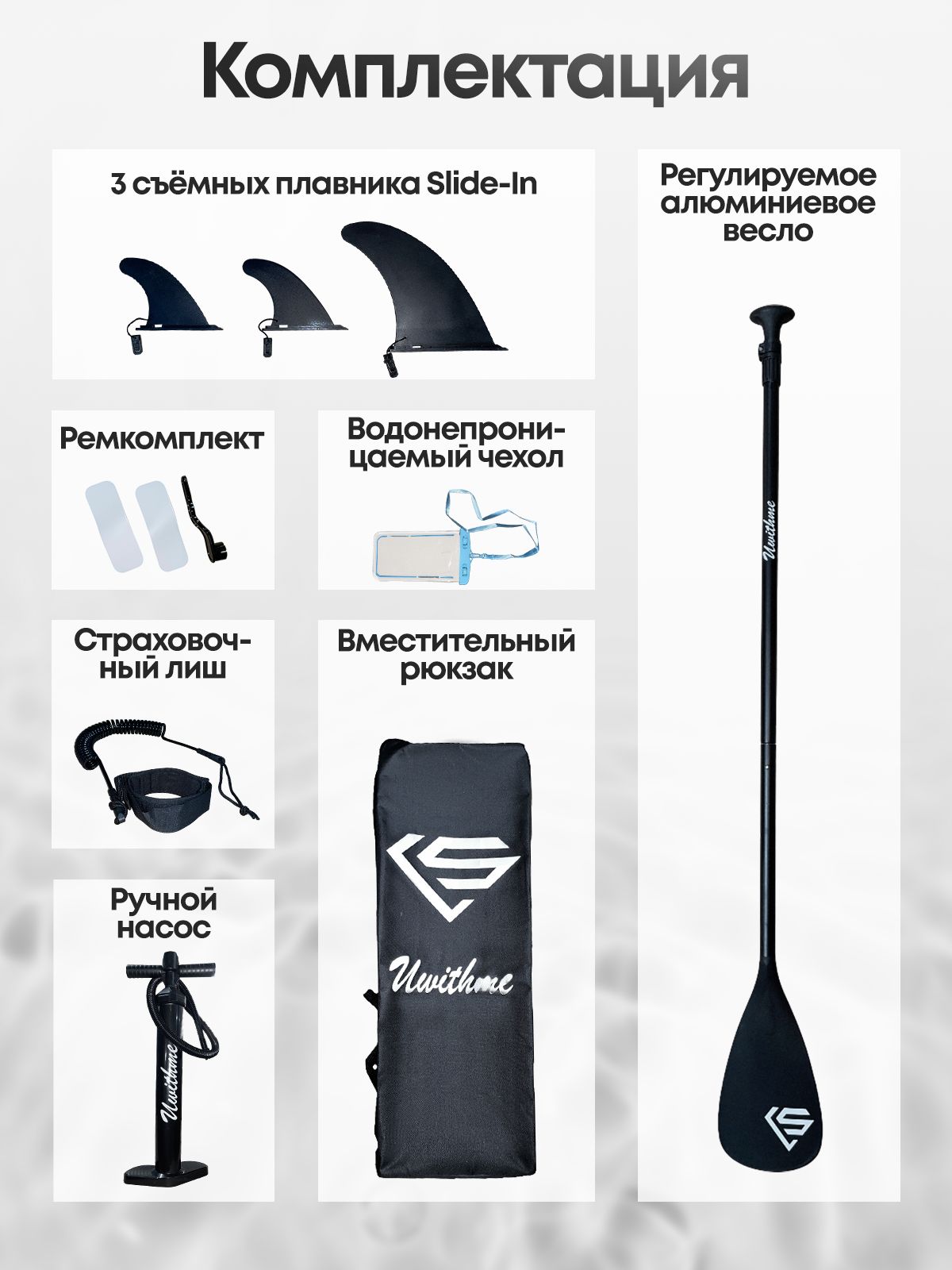 Uwithme Striped Blue — широкий надувной сапборд с шириной 89 см. Это на 5-8 см шире стандартных моделей, что даёт заметно лучшую устойчивость на воде. Если вы только начинаете или ищете сапборд для спокойного катания — ширина 89 см существенно упрощает балансировку. Грузоподъёмность 180 кг.